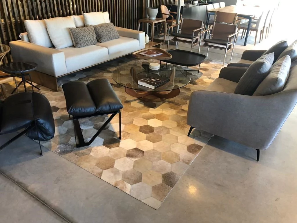 Confeccionado com recortes quadrados de couro legítimo natural em tons bege. Tapete forrado, antiderrapante , impermeável e com tratamento especial para decoração.