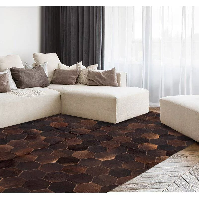Confeccionado com recortes quadrados de couro legítimo natural em tons de café. Tapete forrado, antiderrapante , impermeável e com tratamento especial para decoração.