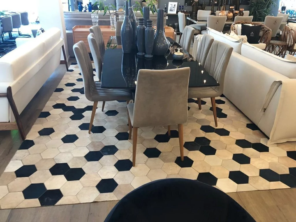 Confeccionado com recortes quadrados de couro legítimo natural em tons marfim, offwhite, pérola, preto e creme. Tapete forrado, antiderrapante , impermeável e com tratamento especial para decoração.