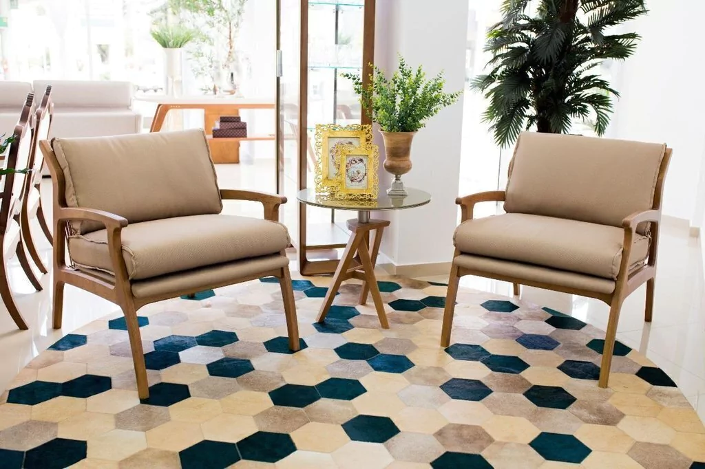 Confeccionado com recortes quadrados de couro legítimo natural em tons bege e preto. Tapete forrado, antiderrapante , impermeável e com tratamento especial para decoração.