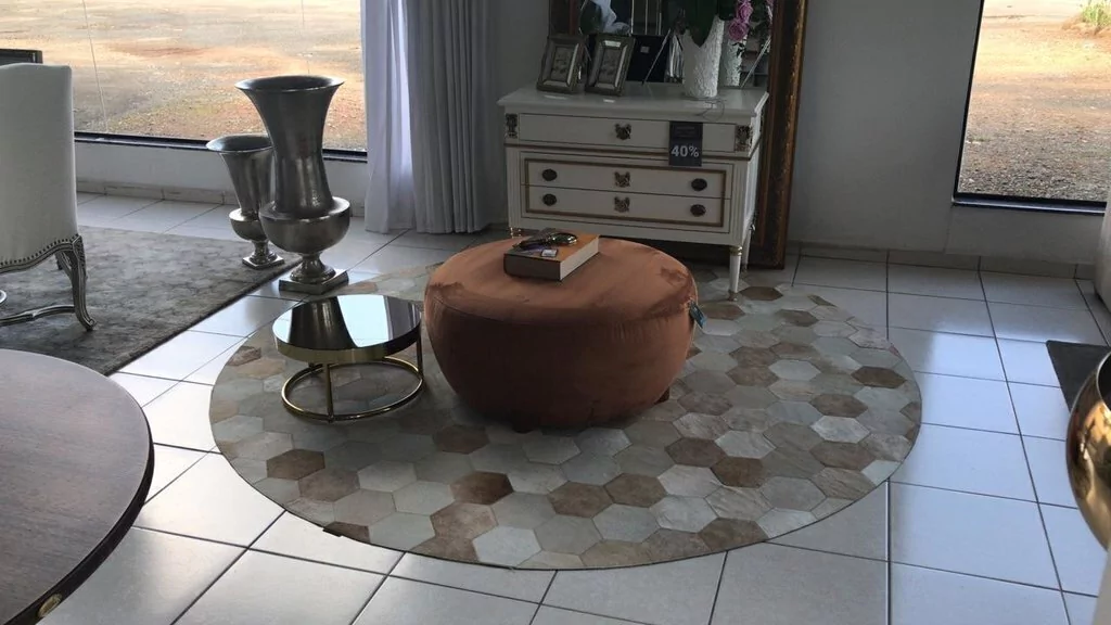 Confeccionado com recortes quadrados de couro legítimo natural em tons champanhe claro, escuro, rosé, bege, cinza e marrom. Tapete forrado, antiderrapante , impermeável e com tratamento especial para decoração.