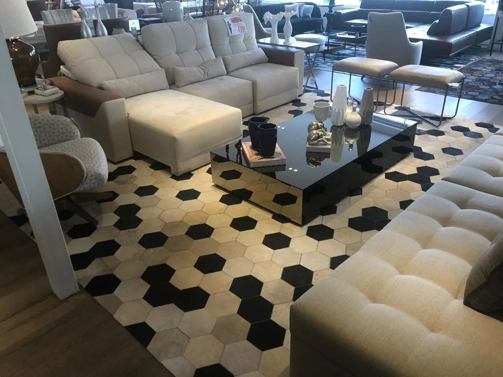 Confeccionado com recortes quadrados de couro legítimo natural em tons preto, cinza e offwhite. Tapete forrado, antiderrapante , impermeável e com tratamento especial para decoração.