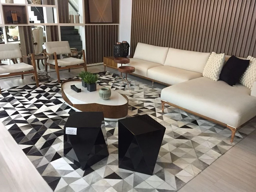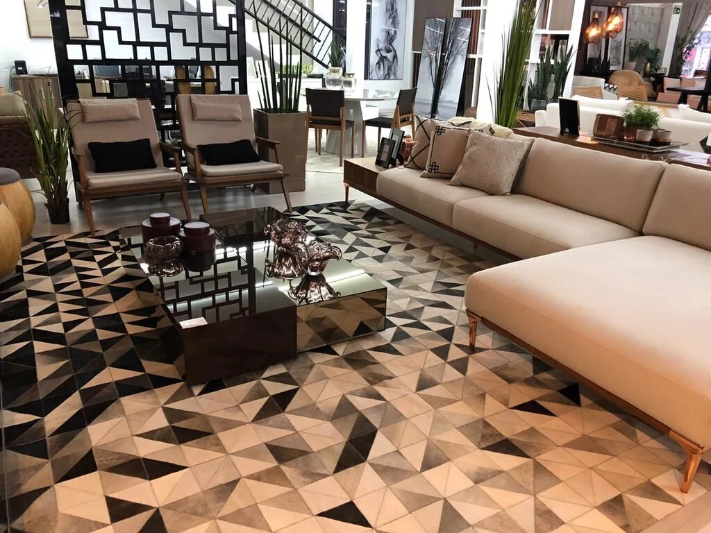 Confeccionado com recortes geométricos de couro legítimo natural em tons preto e cinza. Tapete forrado, antiderrapante , impermeável e com tratamento especial para decoração.
