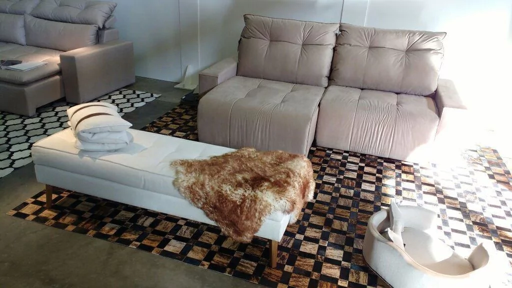 Confeccionado com recortes quadrados de couro legítimo natural em tons preto, marrom, castanho, caramelo e bege. Tapete forrado, antiderrapante , impermeável e com tratamento especial para decoração.