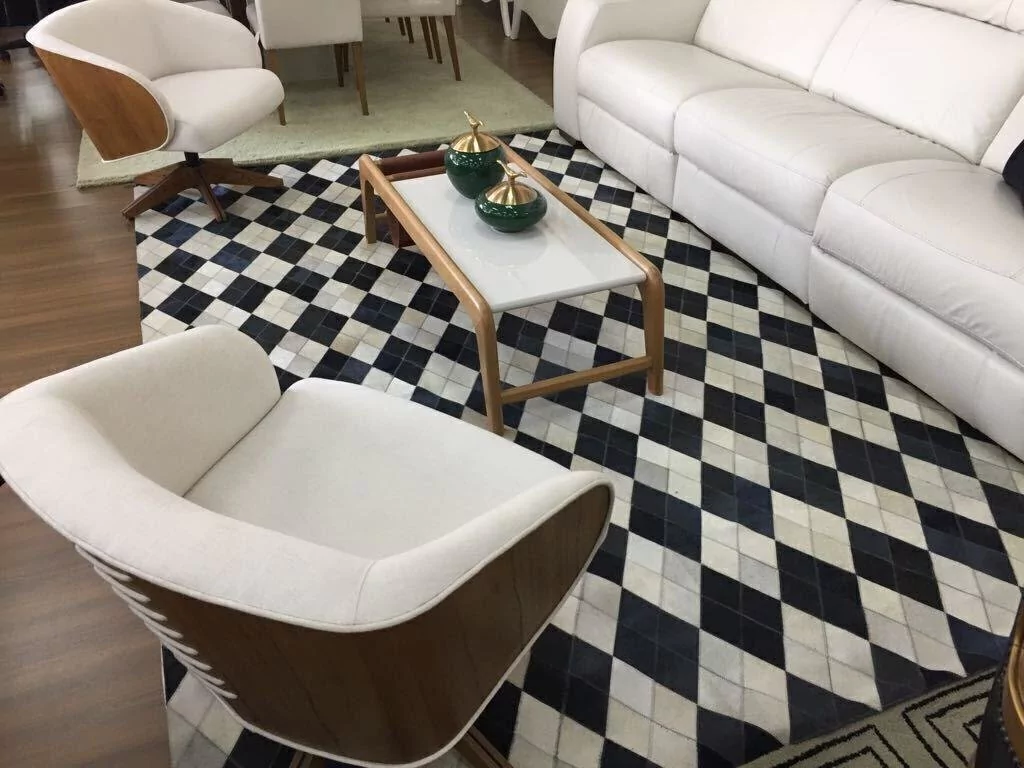 Confeccionado com recortes quadrados de couro legítimo natural em tons preto, branco e creme. Tapete forrado, antiderrapante , impermeável e com tratamento especial para decoração.