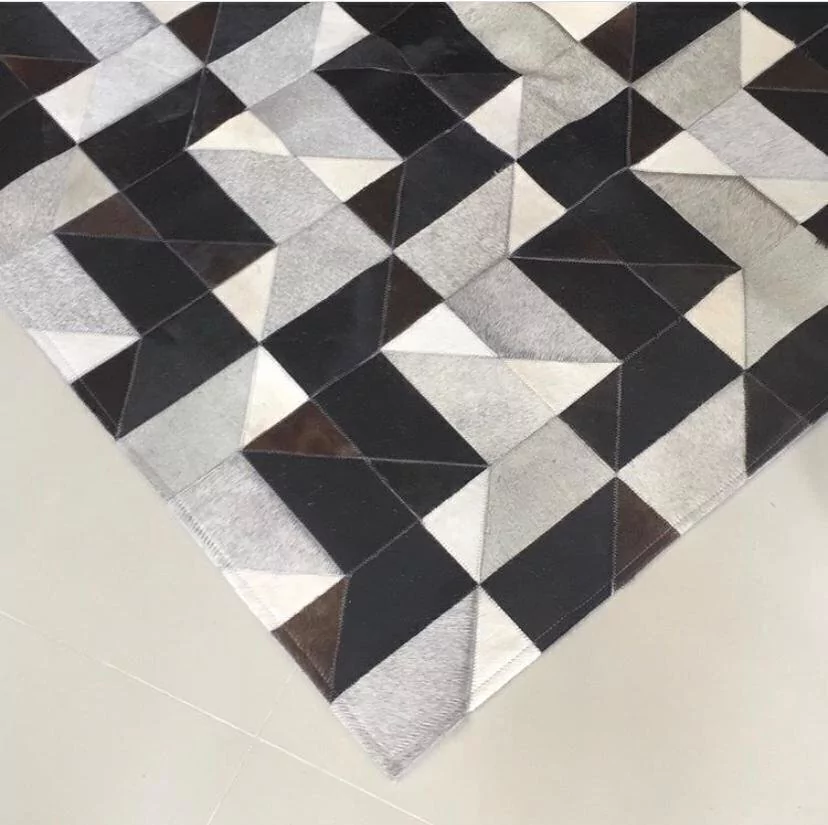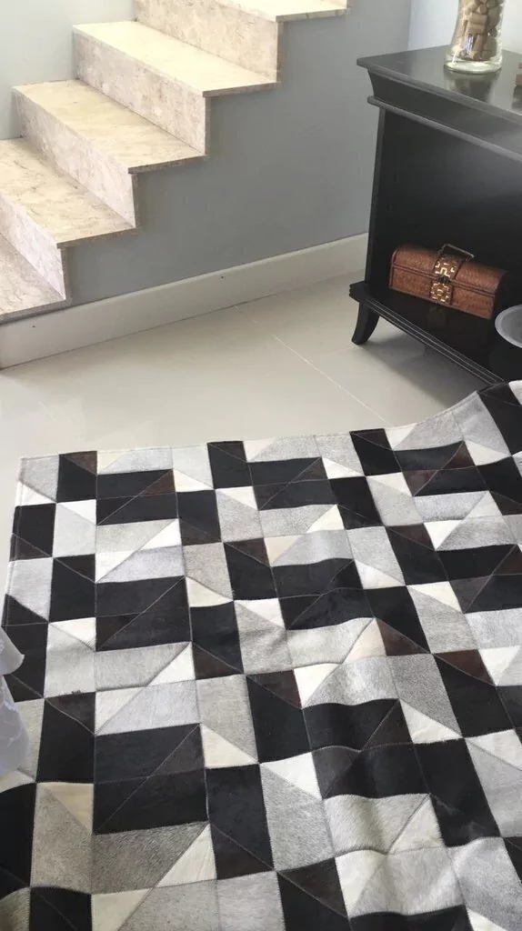 Confeccionado com recortes geométricos de couro legítimo natural em tons de cinza, bege claro, café e preto. Tapete forrado, antiderrapante , impermeável e com tratamento especial para decoração.