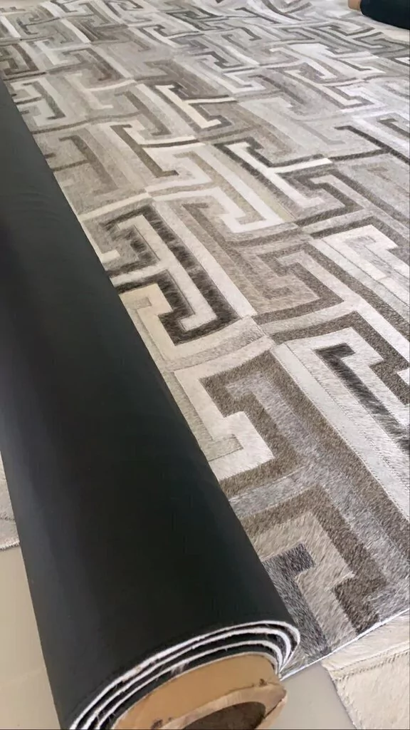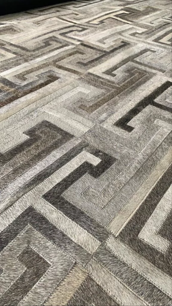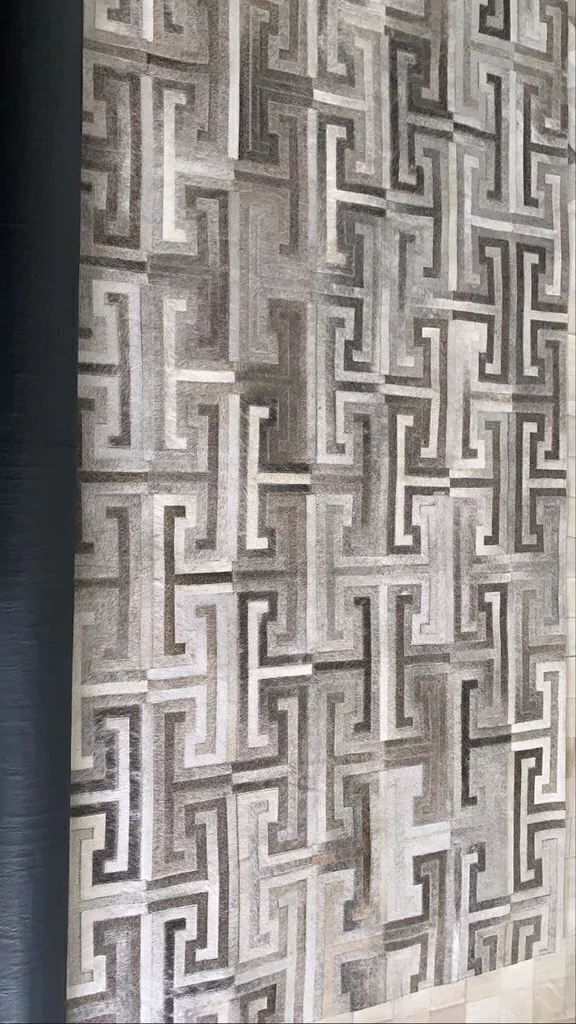 Confeccionado com recortes geométricos de couro legítimo natural em tons de cinza, branco e creme. Tapete forrado, antiderrapante , impermeável e com tratamento especial para decoração.