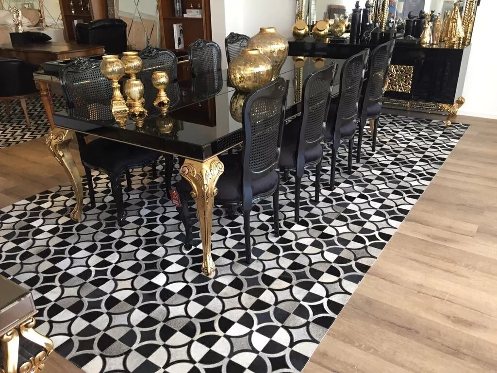 Confeccionado com recortes quadrados de couro legítimo natural em tons preto, gris grey, branco e marrom. Tapete forrado, antiderrapante , impermeável e com tratamento especial para decoração.