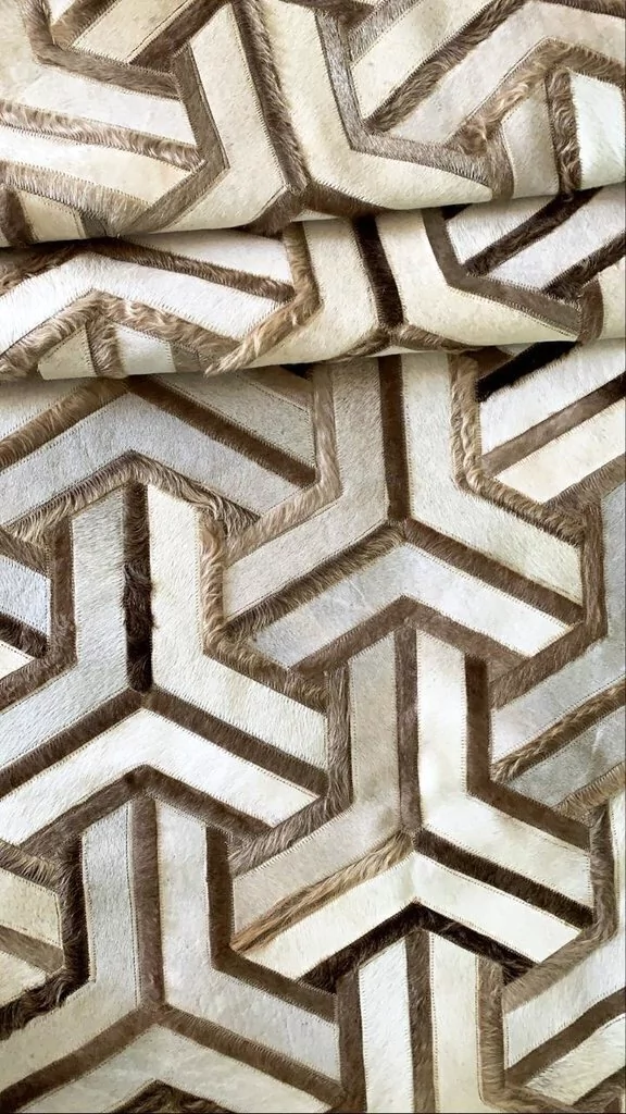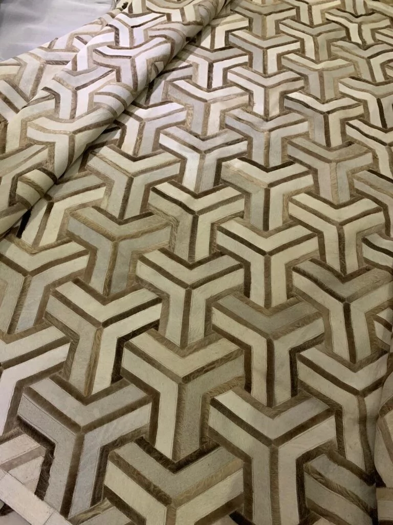 Tapete de Couro confeccionado com recortes geométrico de couro legítimo natural em tons off white, champanhe e creme. Tapete forrado, antiderrapante e com tratamento especial para decoração.