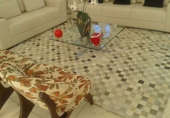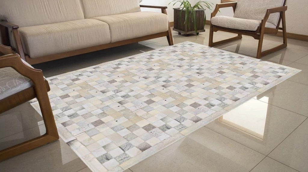 Confeccionado com recortes quadrados de couro legítimo natural em tons de prata, cinza claro e bege claro. Tapete forrado, antiderrapante , impermeável e com tratamento especial para decoração.