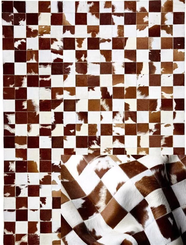 Confeccionado com recortes quadrados de couro legítimo natural em tons malhados marrom e branco. Tapete forrado, antiderrapante , impermeável e com tratamento especial para decoração.
