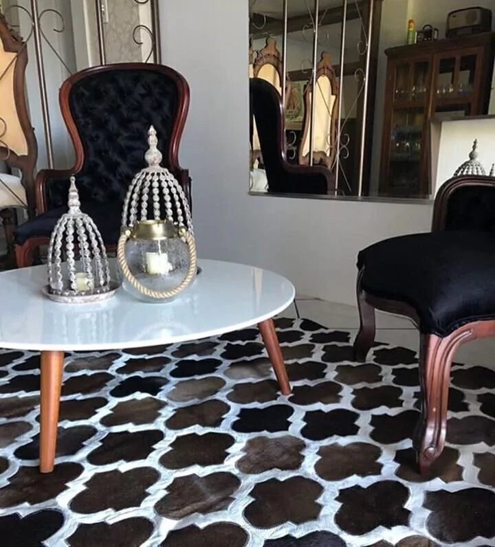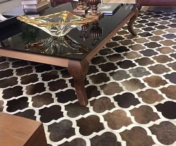 Confeccionado com recortes especiais de couro legítimo natural em tons de café e contorno branco. Tapete forrado, antiderrapante , impermeável e com tratamento especial para decoração.