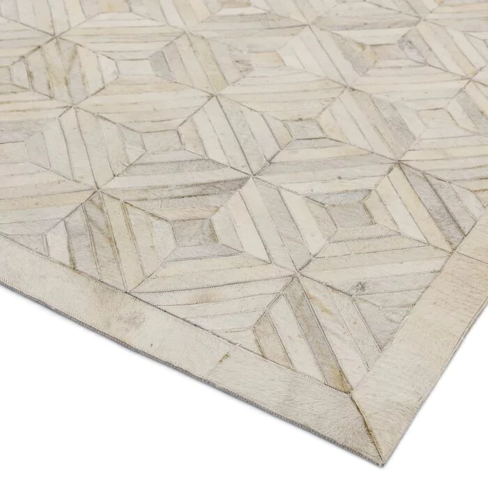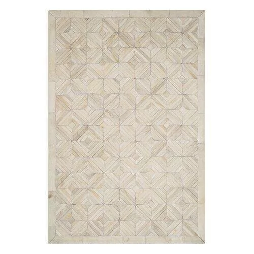 Confeccionado com recortes especiais de couro legítimo natural em tons bege claro e creme. Tapete forrado, antiderrapante , impermeável e com tratamento especial para decoração.
