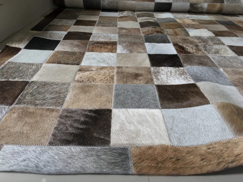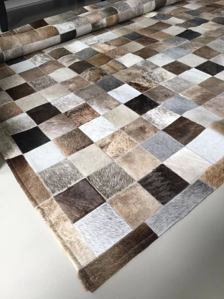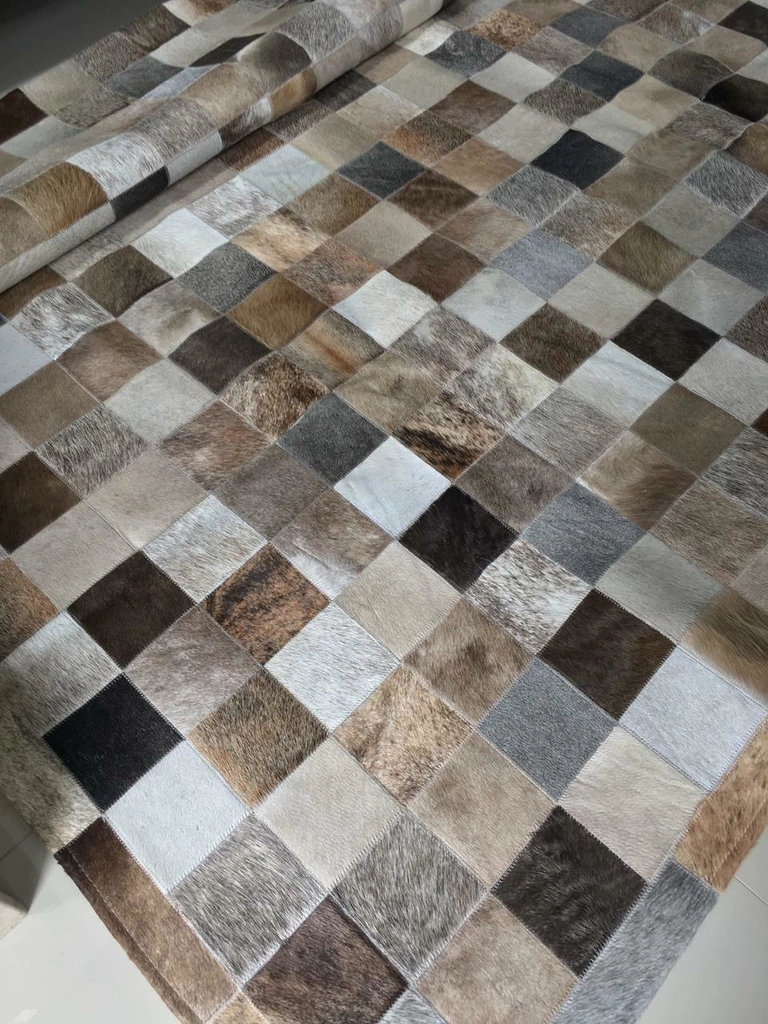 Tapetes em couro légitimo montado com recortes quadrados de couro legítimo natural em tons mesclados. Tapete forrado, antiderrapante , impermeável e com tratamento especial para decoração.