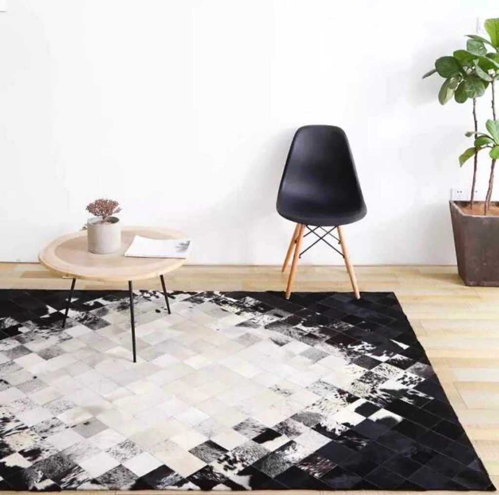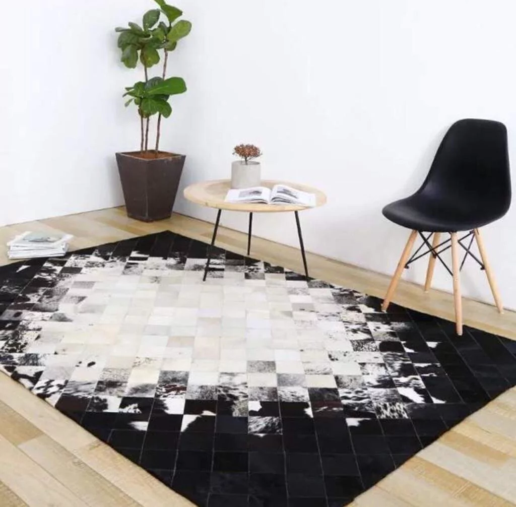 Confeccionado com recortes quadrados de couro legítimo natural em tons de preto e prata. Tapete forrado, antiderrapante , impermeável e com tratamento especial para decoração.