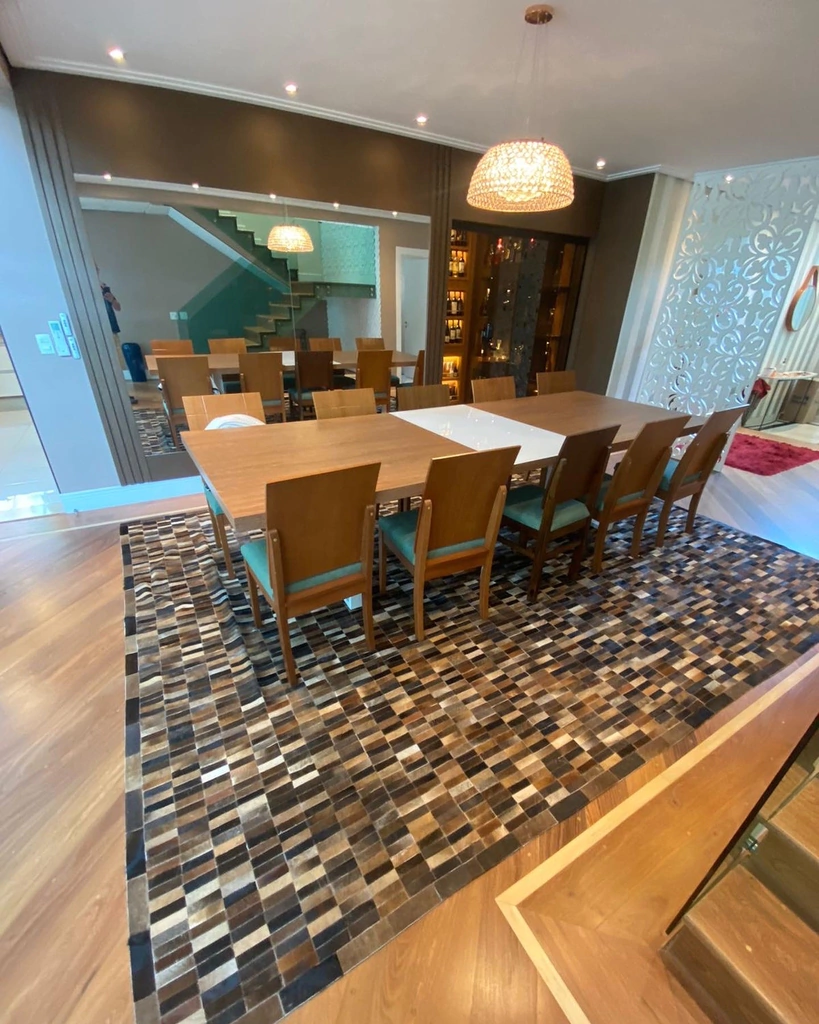 Confeccionado com recortes quadrados de couro legítimo natural. Tapete forrado, antiderrapante , impermeável e com tratamento especial para decoração.