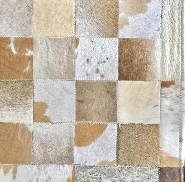 Confeccionado com recortes quadrados de couro malhado legítimo natural em tons de bege natural . Tapete forrado, antiderrapante , impermeável e com tratamento especial para decoração.