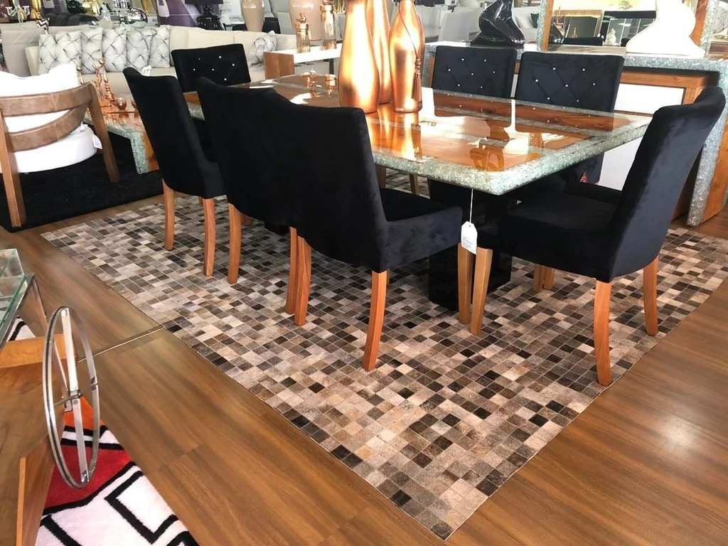 Confeccionado com recortes quadrados de couro legítimo natural em tons dark gris grey, bege, creme, marrom,e branco. Tapete forrado, antiderrapante , impermeável e com tratamento especial para decoração.
