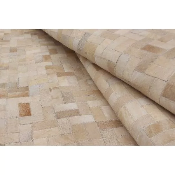Confeccionado com recortes de couro legítimo natural em tons de bege e creme. Tapete forrado, antiderrapante , impermeável e com tratamento especial para decoração.