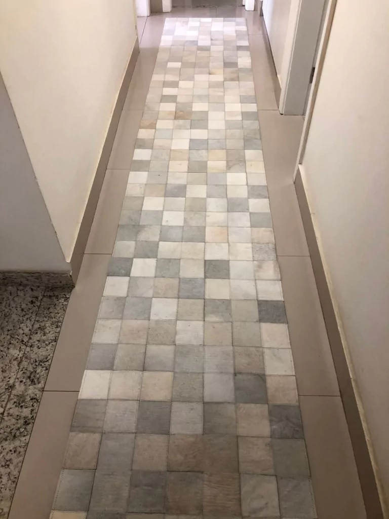 Confeccionado com recortes retangulares de couro legítimo natural em tons cinza e prata. Tapete forrado, antiderrapante , impermeável e com tratamento especial para decoração.