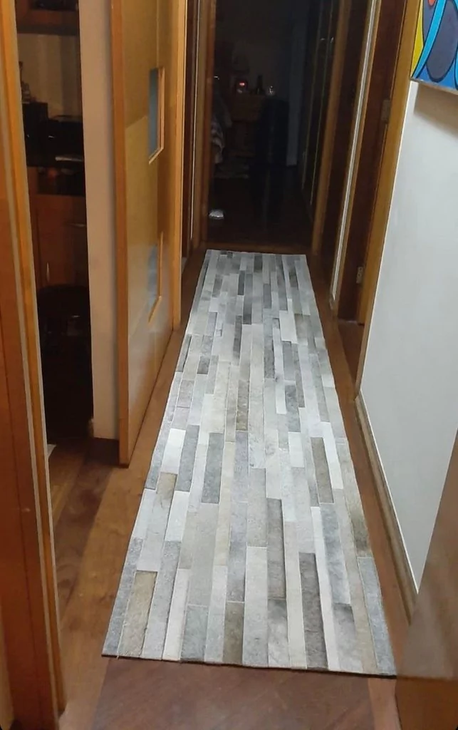 Confeccionado com recortes retangulares de couro legítimo natural em tons cinza e prata. Tapete forrado, antiderrapante , impermeável e com tratamento especial para decoração.