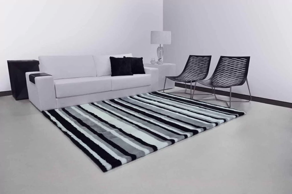 Confeccionado com recortes quadrados de pele ovina legítima nos tons de branco, preto e cinza. Tapete com forro 100% algodão e e com tratamento especial para decoração. Certificação ISO 9001 de qualidade internacional.
