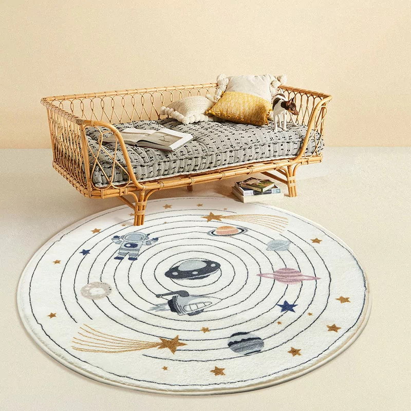 Tapete Infantil Galaxia redondo confeccionado em poliester com pelo alto e estampas decorativas lindas e divertida. Com boa espessura ideal para bebês recém nascidos brincarem e antiderrapante na base evita deslizamento. Excelente isolante térmico e acústico com alta retenção a umidade. Fácil limpeza podendo ser lavado à mão ou máquina.