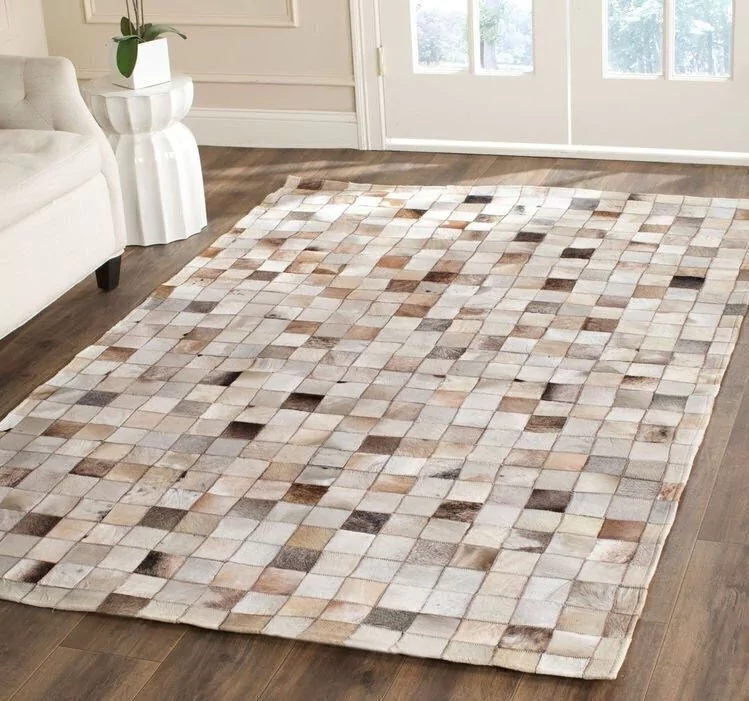 Confeccionado com recortes de couro legítimo nos tons de bege e caramelo naturais. Tapete forrado, antiderrapante , impermeável e com tratamento especial para decoração.