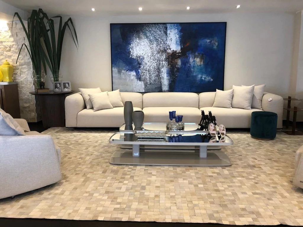 Confeccionado com recortes quadrados de couro legítimo natural em tons cinza, marfim e branco. Tapete forrado, antiderrapante , impermeável e com tratamento especial para decoração.